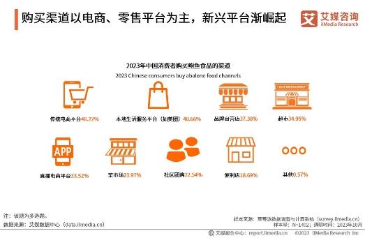 iiMedia Research(艾媒咨询)数据显示,传统电商平台是消费者购买鲍鱼食品的主要渠道,占比46.22%,其次是本地生活服务平台,占比达40.66%,品牌自营店、超市、直播电商平台等渠道也占有一定比例。过去鲍鱼食品销售渠道多以传统电商平台、品牌自营店、超市为主,2023年以来,直播电商崛起速度加快,消费者的购买方式出现明显的便利性偏好,直播平台等新兴渠道渐成为商家主要战场,并为商家提供更多样的渠道布局思路。